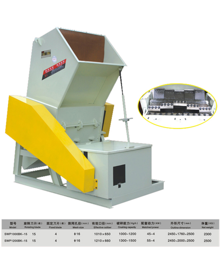 SWP1000BK-15、1200BK-15、1200BK-15 type Rubber and plasticcrusher feeding convenient,Canbetter crushing small pieces of material,Adopt folding knife type design.High toughness tool.Repeatedly cut materials,Make products with minimum block way smash,Greatly reduced shattered loads.